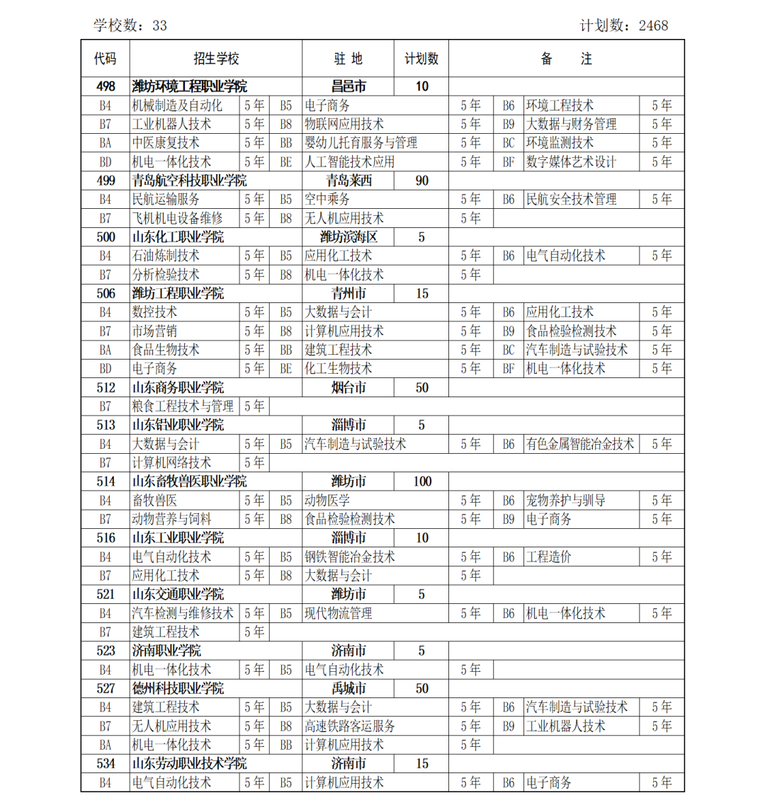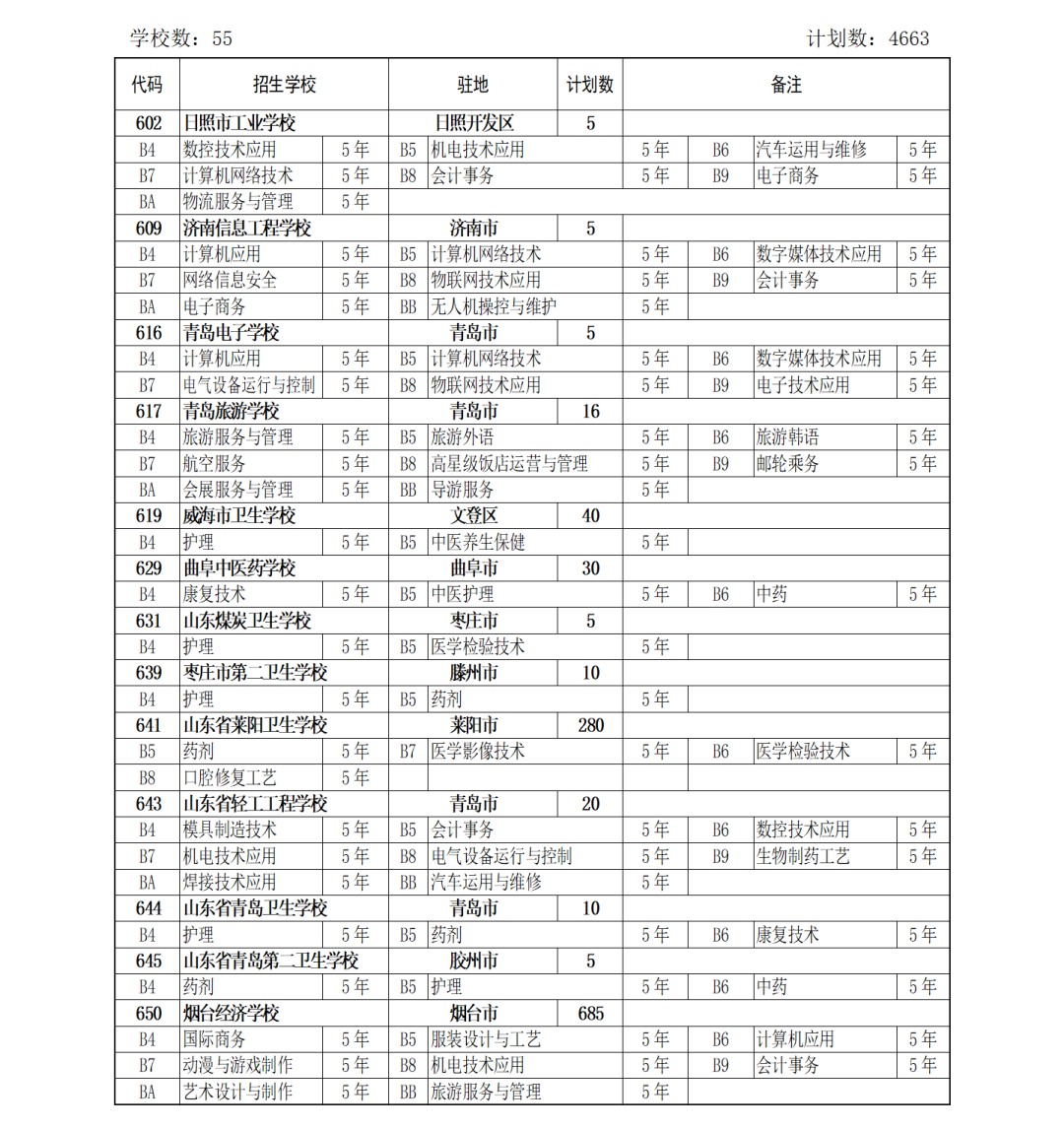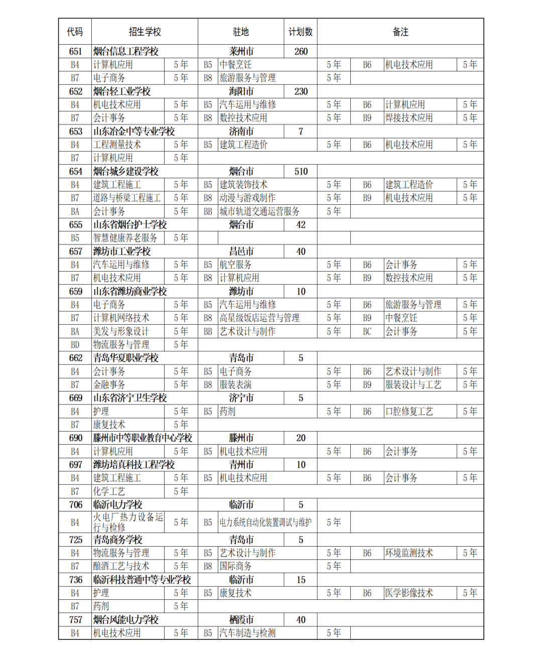烟台市2021年五年一贯制高等职业教育招生来源计划