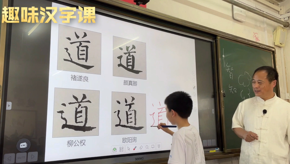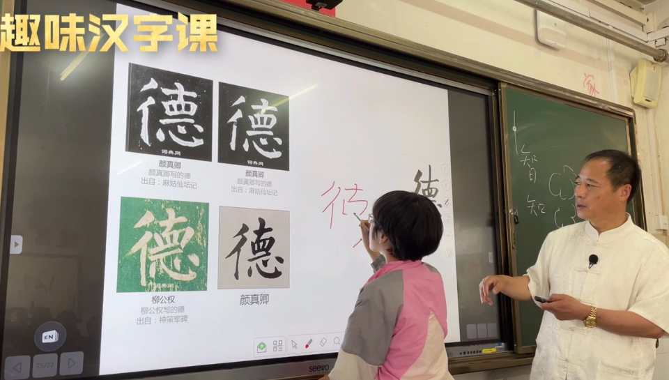 如何把字写得又快又好?在书法环节,同学们积极踊跃参与互动,上台书写,齐颂老师根据出现的问题加以指正,让孩子们能够快速掌握“道德”二字的书法要领。
