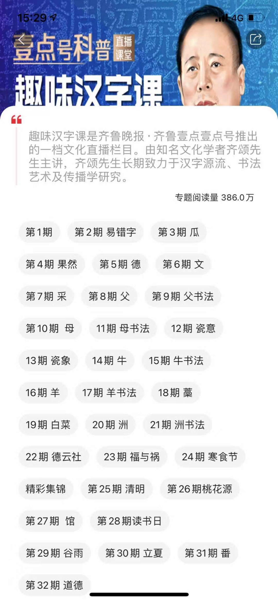 《趣味汉字课》是齐鲁晚报·齐鲁壹点壹点号科普直播课堂开设的一档栏目,栏目以中小学生和家长老师为目标受众,从2020年11月开播至今,平均每期直播各平台总播放量50万左右,互动评论千余条。截至目前,仅在齐鲁壹点平台上,栏目的总点击量已达386万。