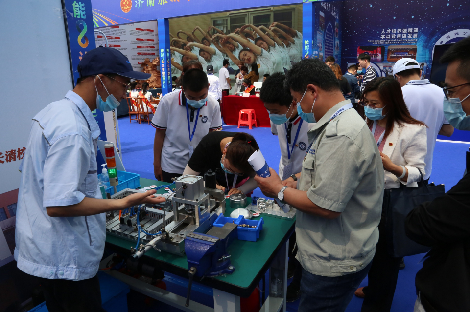 活动现场,山东劳动职业技术学院还设置了互动环节,推出研学实践和职业体验观摩活动。通过口罩机展示防护口罩的生产过程。2020年疫情期间,从口罩一只难求,到口罩机一机难求,再到口罩机研发、制造、维修人才一人难求,企业深深的感受到口罩机研发的重要性。学院教职工用自己的技术技能优势,和校企合作企业诺贝尔(山东)科技实业有限公司联合,进行技术攻关,完成口罩机的研发制造。在企业最需要生产人员的时候,劳职学子挺身而出,助力企业复工复产,被媒体广为报道。现场展示的口罩机是学院“产教深度融合,校企共同抗疫”的成果,背后的抗疫故事、技术攻关故事也打动了在场的参观者。