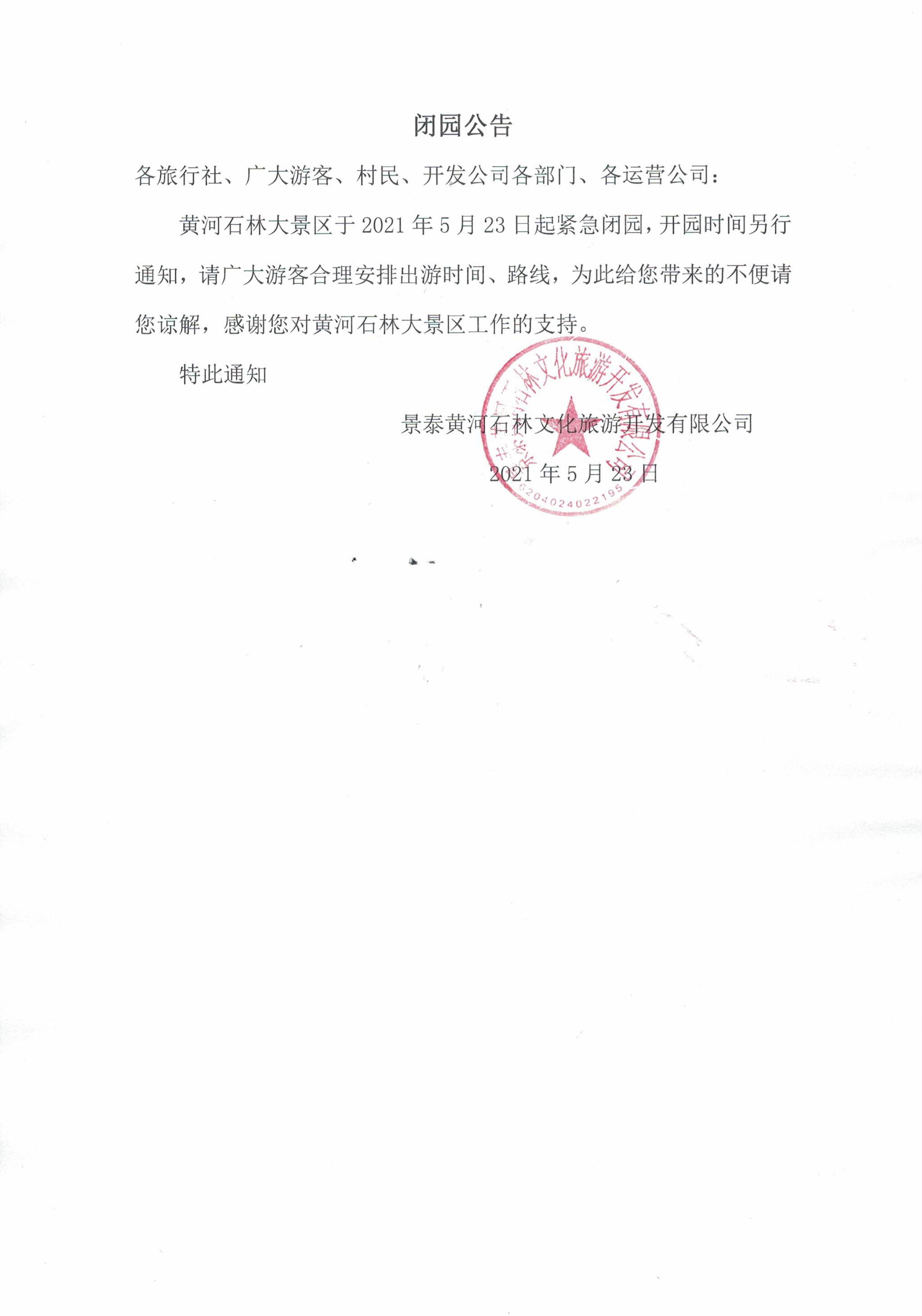 @黄河石林大景区 5月23日发布《景区闭园公告》: