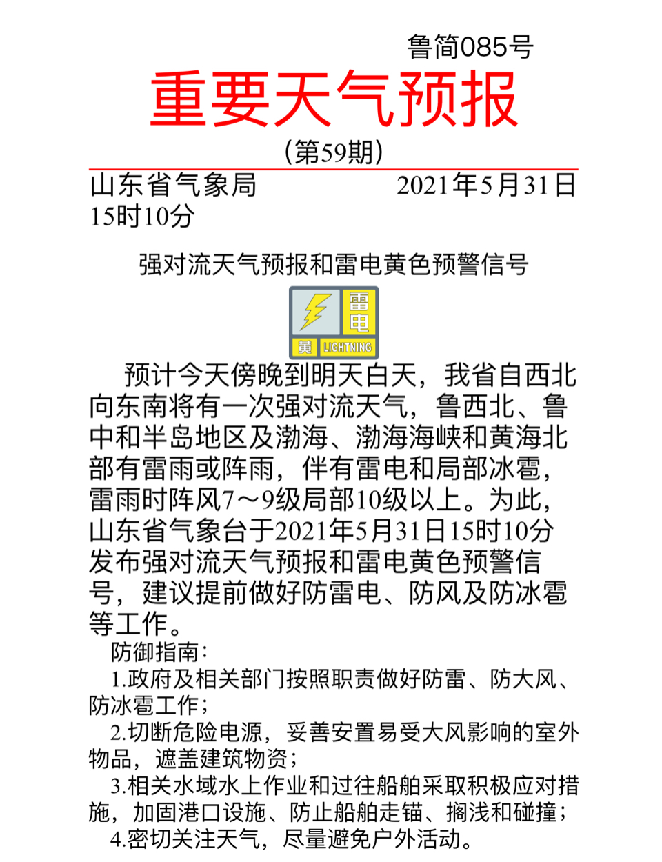 31日15时10分,山东省气象台发布强对流天气预报和雷电黄色预警信号,建议提前做好防雷电、防风及防冰雹等工作。