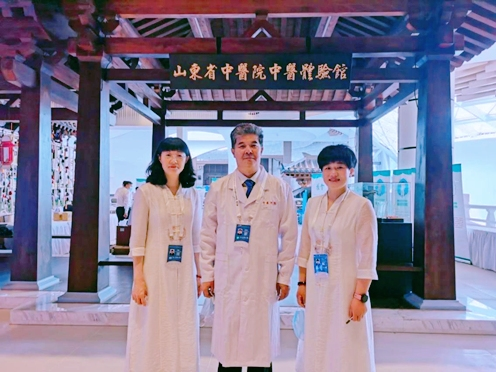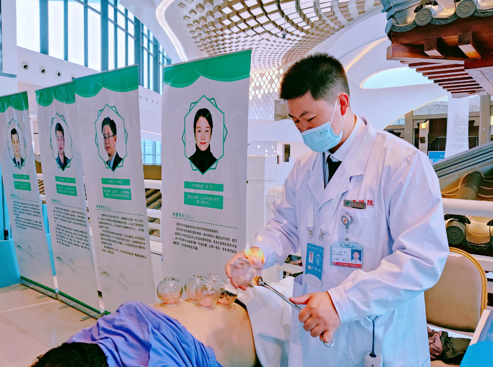山东省中医院外治团队由杨继国教授、鲁士友副主任医师、郝明耀主治医师组成,经过精心的准备,给来自全球的嘉宾展现了中医外治法的“简便”和“效验”,现场展示脐疗、督灸、药物罐、耳穴压豆、全息诊疗等经过几代省中医人开拓创新的中医外治技术。
