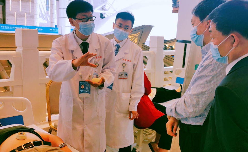 在2021年6月2号的第二天大会活动中,国家中医药管理局和山东省卫健委领导在任勇院长的陪同下,来到山东省中医院中医体验区巡馆针灸体验区,杨佃会教授首先向各位领导介绍了针灸科的传统特色疗法,同时重点介绍了穴位贴敷疗法和浮针疗法。
