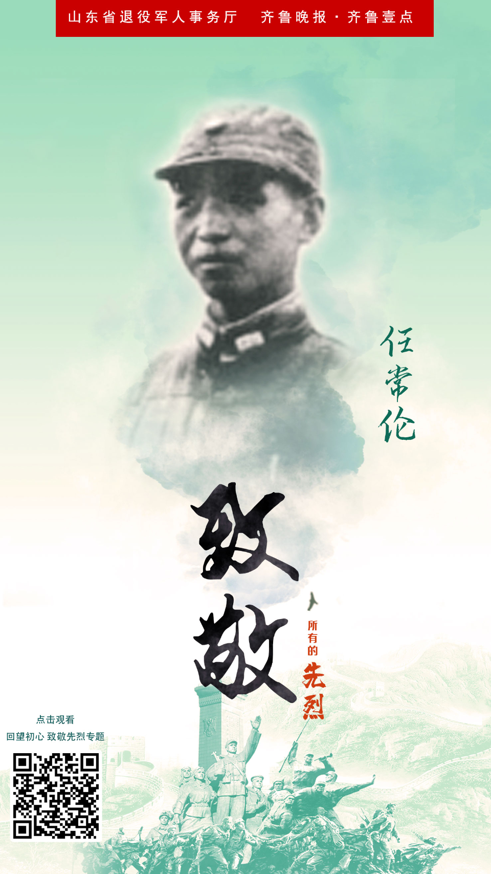 回望初心·致敬先烈海报㉔丨任常伦烈士:战斗英雄 英勇杀敌 云端党课 2021-06-18 5126 在全党开展党史学习教育中,为了铭记党史,缅怀先烈,山东省退役军人事务厅、齐鲁晚报·齐鲁壹点联合主办,共同推出“回望初心·致敬先烈”专题策划,重温中国共产党为中国人民谋幸福、为中华民族谋复兴的不变初心。今天推出任常伦的故事。 责任编辑:李和晴