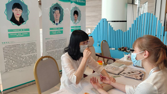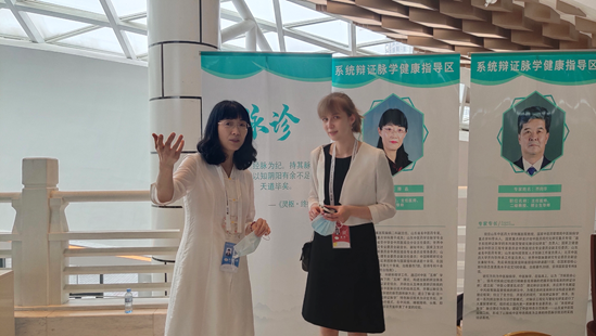 滕晶教授作为脉诊展区的核心成员之一,她将中医“望诊”、“五神”理论和“系统辨证脉学体系”三者有效结合,发挥上医治“神”的治疗理念,让参会代表充分体验跨越时空的神奇中医之美。找滕教授体验脉诊每天都排起长队,每次诊断之后滕教授都能依据体验者的脉象特征精准判断其体质、心理状态和气血阴阳的变化,并给予合理的治疗方案,让体验者们连连称奇,其中不乏包括许多外国友人。