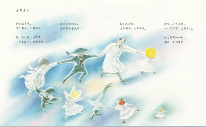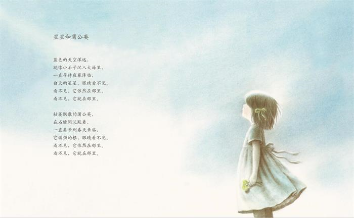 还有一处很重要。那就是咏出了“做不到”和“不知道”,比如“不能在天空飞翔”,“ 摇不出美丽的声响”……诗人让我们记起来,我们也是一开始什么都做不到,什么都不知道,后来才慢慢学会了,慢慢地知道了。她让我们意识到:大家都有各自的时间和容积,都是不可媲美的完美存在。