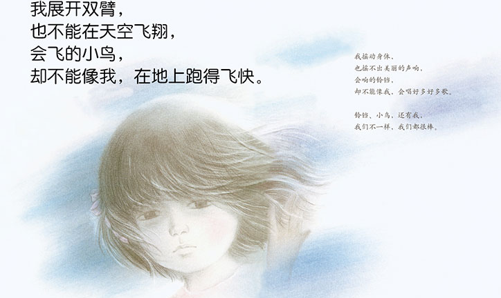 这首童谣的点睛之处是倒数第二句。这一句跟题目一样,只是变换了一下词语的顺序,由“我和小鸟和铃铛”变成了“铃铛、小鸟,还有我”,用日本当代童谣诗人、金子美玲纪念馆馆长矢崎节夫的话来说,“我和你”变成“你和我”,就不再是先己后人的思维了,就出现了“我们不一样,我们都很棒”这样的视角。