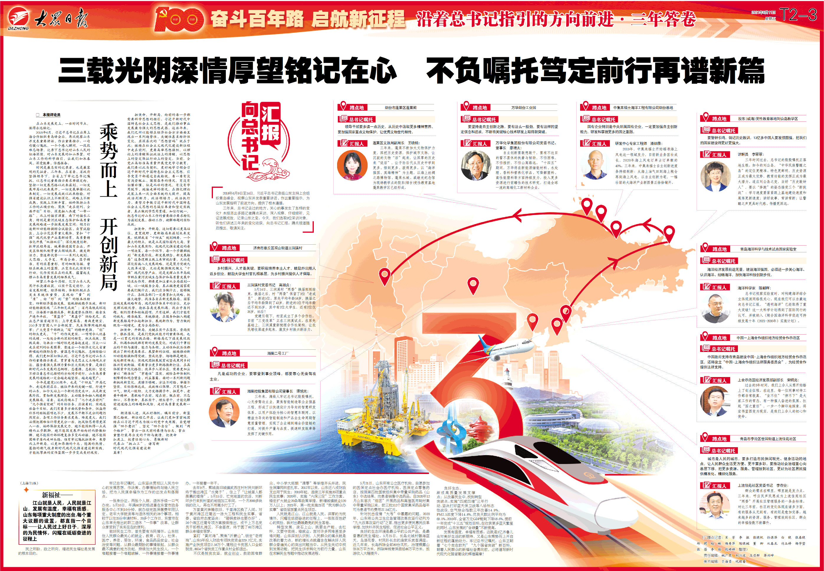 时间是最忠实的记录者,也是最客观的见证者。三年来,在省委、省政府坚强领导下,全省上下牢记总书记嘱托,以总书记重要指示要求举旗定向,坚持一切发展思路以此来谋划、一切发展布局以此来展开、一切发展举措以此来制定、一切发展成效以此来检验,对强省建设认识上不断深化、战略上不断成熟、实践上不断丰富,始终保持山东工作的正确方向。聚焦“走在前列、全面开创”目标,深度融入共建“一带一路”,北上对接京津冀,南下对接长三角,特别是黄河流域生态保护和高质量发展战略进一步拓展发展空间;倾力打造新旧动能转换综合试验区、自贸试验区、上合示范区等重大载体,紧扣“十强”现代优势产业集群培育,高质量精准化开展“双招双引”;深化制度创新,抓牢流程再造,统筹推进国有企业、开发区体制机制等重点领域改革,激发新活力、塑造新优势……一系列大规划、大思路、大手笔,布局全面、落子精准,有的浓墨重彩,有的细线勾描,曾经在纸面上的蓝图,正变为扎扎实实的行动,化作实实在在的成果,蕴蓄起支撑山东高质量发展的雄厚底气。