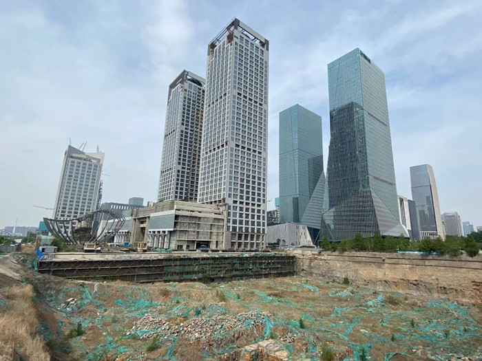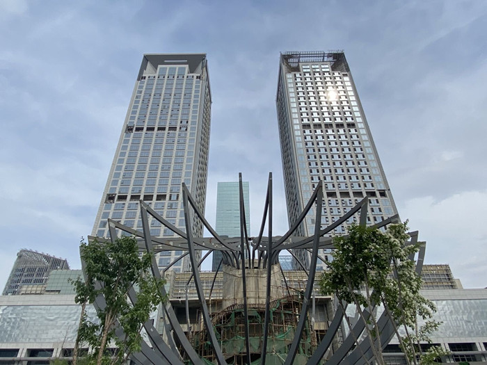 经济导报记者看到,在超高层地块周边,除了最北侧一栋副楼已建成投用,另外两栋副楼的外立面已经呈现出来,但尚未全面完工;一个碗形建筑颇为显眼,钢筋架构已锈迹斑斑。