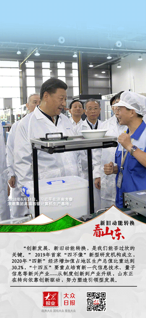 “创新发展、新旧动能转换,是我们能否过坎的关键”。 2018年6月14日,习近平总书记在济南考察浪潮集团高端容错计算机生产基地时,对山东高质量发展寄予厚望,为山东加快新旧动能转换、实现高质量发展指明了前进方向,提供了根本遵循。