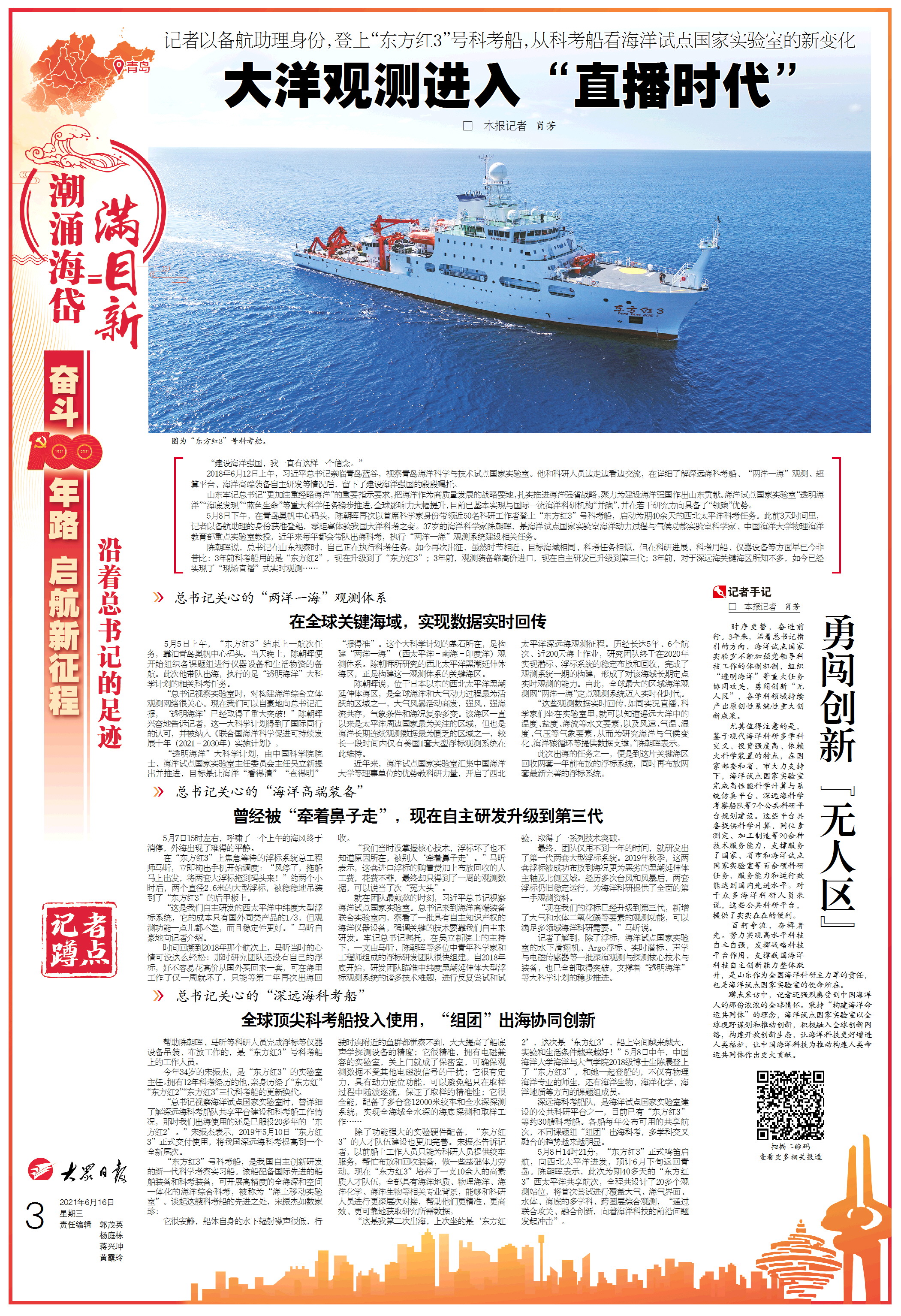 时序更替,奋进前行。3年来,沿着总书记指引的方向,海洋试点国家实验室不断加强党领导科技工作的体制机制,组织“透明海洋”等重大任务协同攻关,勇闯创新“无人区”,各学科领域持续产出原创性系统性重大创新成果。