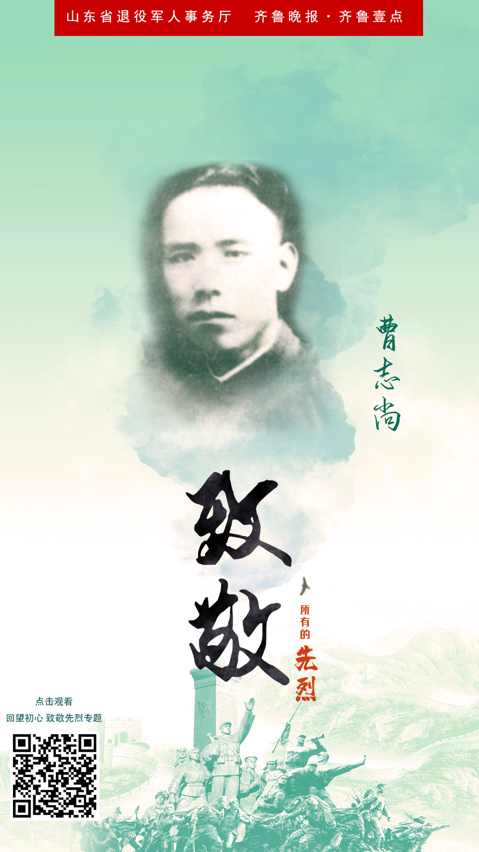 回望初心·致敬先烈海报㉛ |曹志尚:名垂青史 气壮丹霄 云端党课 2021-09-01 4401 在全党开展党史学习教育中,为了铭记党史,缅怀先烈,山东省退役军人事务厅、齐鲁晚报·齐鲁壹点联合主办,共同推出“回望初心·致敬先烈”专题策划,重温中国共产党为中国人民谋幸福、为中华民族谋复兴的不变初心。今天推出曹志尚的故事。 责任编辑:李和晴