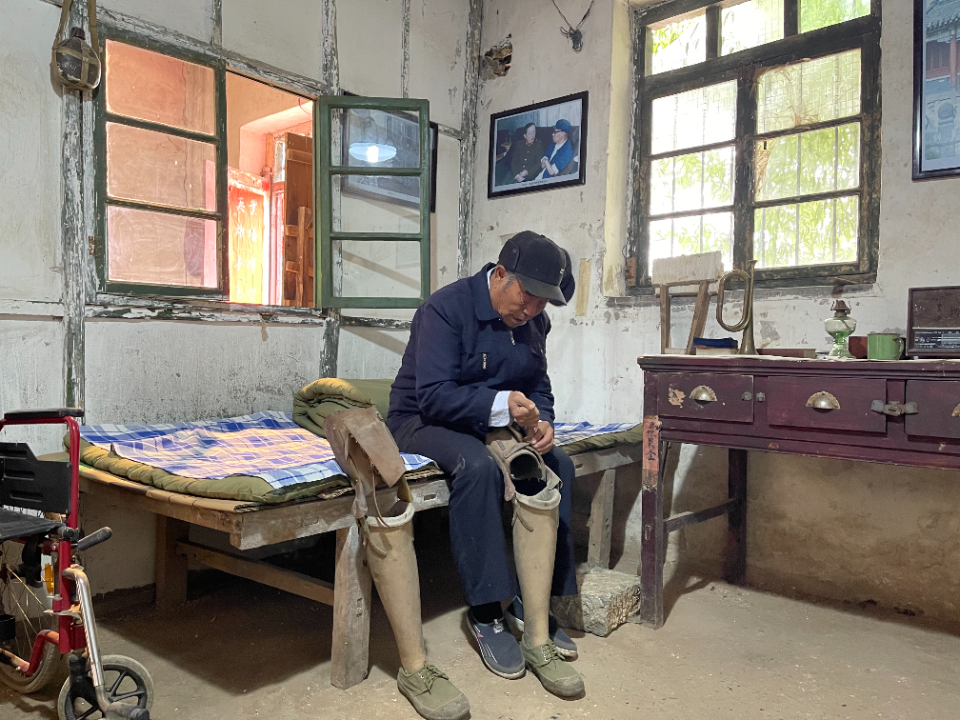 “俺舅不管那些,他有自己的想法和坚持。刚回来生活上各个方面都得锻炼,吃饭、刷牙、洗脸,他都要自己干。”说到动情处,赵圣贵就坐到床边,拿起假肢来给记者演示朱彦夫穿假肢的过程。“上腿是最难办的,穿上假肢是有三个阶段,第一个阶段就是先缠绷带,他手臂用不上劲,我小时候也没劲,缠松了又不行,三缠两缠假肢就滚出去了,我就帮忙拾回来,我们爷俩接着缠,上面的带子缠好了之后,再装进假腿里,他用两个手臂抬着,我的小手也一起拽着,等穿上假腿,我们就被汗浸透了。”一边说着,赵圣贵一边就把假肢的皮扣扣到了自己腿上。他告诉记者,朱彦夫虽然能穿上假肢站起来,但行走却是用了一番时日和功夫,不少次都是哐当一下摔倒,他就用双臂撑着地面,再站起来接着走。