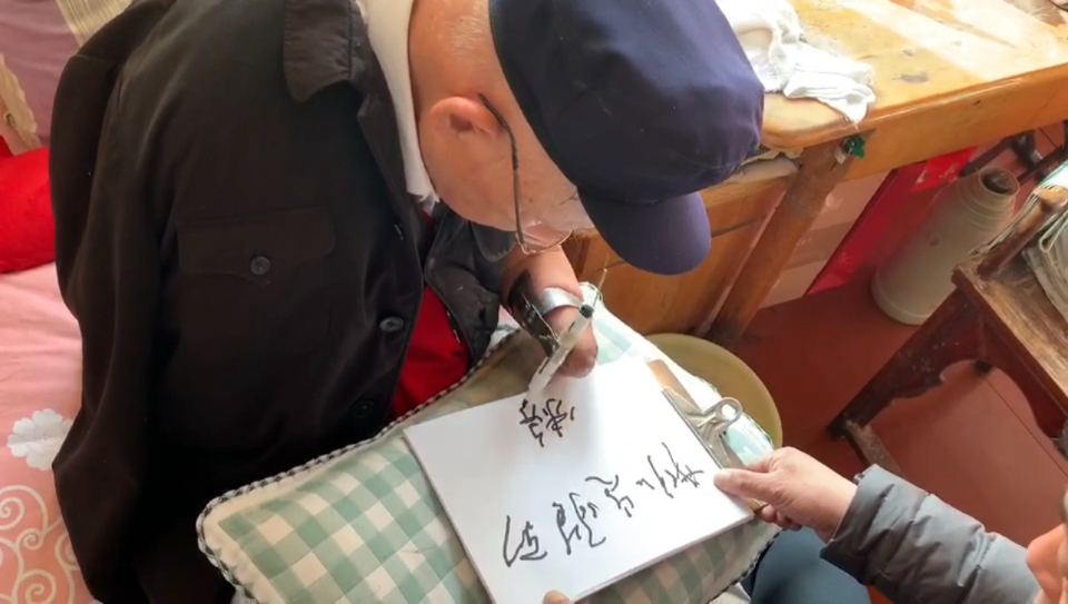 在朱帅宗的手机里,保存着朱彦夫去年写字的一段视频。视频中的朱彦夫右臂尽量支撑着,挥动着左臂对着铺在被褥上的白纸,极力把笔头划到纸面上,一笔一划写出“我们一定胜利”六个字,“这也是我们一家三代人努力的目标。”朱帅宗说。