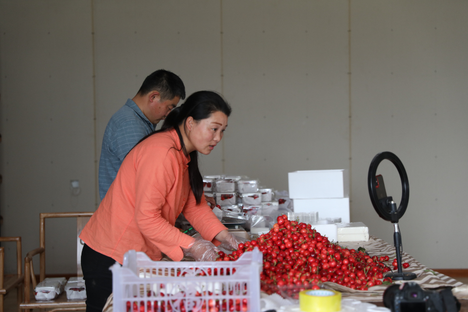 (图为牛庆花与丈夫一边包装樱桃,一边直播)