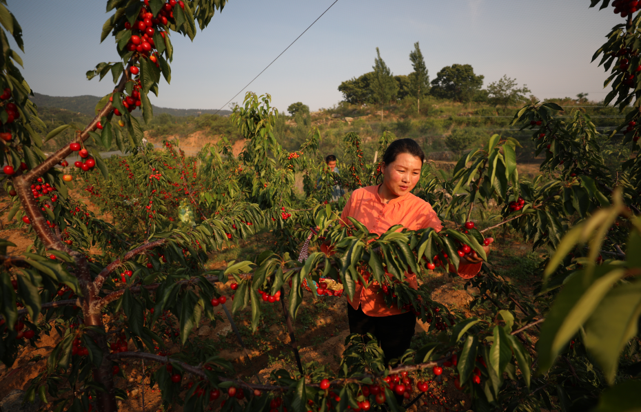 5月中旬,樱桃正红,蒙阴县野店镇北晏子村村民牛庆花忙得热火朝天。
