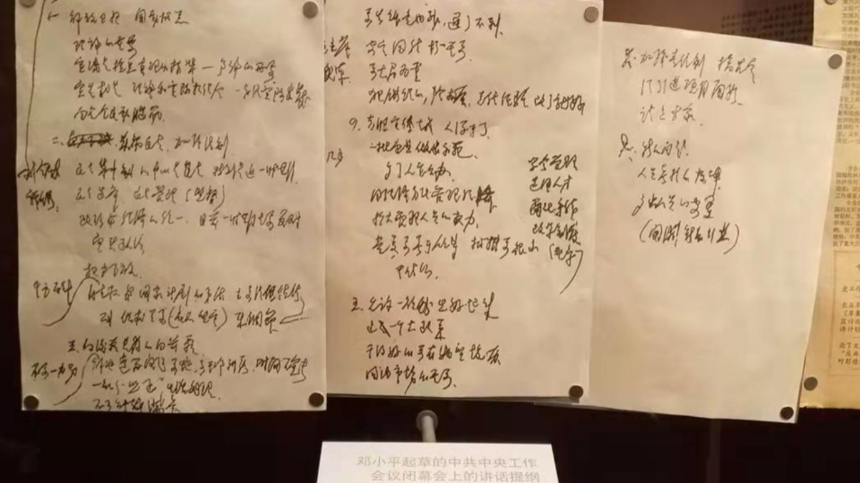 此时,中央工作会议正在民主大发扬的热烈气氛中进行,而议程已经过半,时间非常紧迫。小平同志拿出了他亲笔拟出的讲话提纲。这份提纲在邓小平逝世后,在于光远家中找到了。这份提纲是邓小平用铅笔写在16开的白纸上的,一共3页,近500字。列了7个方面的问题:一、解放思想,开动机器;二、发扬民主,加强法制;三、向后看是为的向前看;四、克服官僚主义、人浮于事;五、允许一部分先好起来;六、加强责任制,搞几定;七、新的问题。在最前边,还加了“对会议评价”一句。这当然是指对中央工作会议的评价。这篇讲话在定稿时整合为四个方面问题。