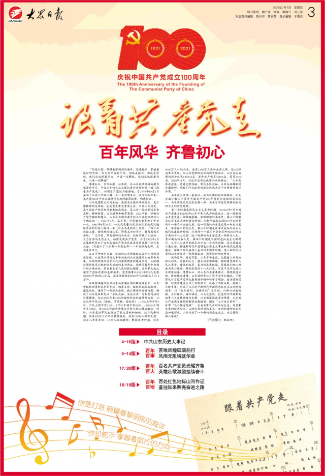 风雨百年,青史可鉴。今天,大众日报推出庆祝中国共产党成立100周年特别报道,以“跟着共产党走·百年风华 齐鲁初心”为主题,图文并茂展现建党百年来发生在齐鲁大地的经典瞬间,讲述百年党史里的山东贡献。