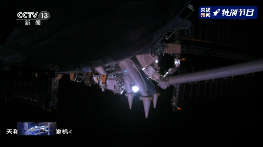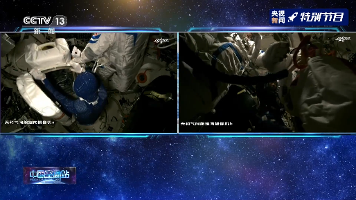 两名航天员都已出舱。刘伯明是在8:26左右出舱,他搭乘机械臂进行大范围转移。之后汤洪波出舱,借助扶手进行舱外爬行,两人前往位于大柱段和小柱段交汇处的作业点会合。