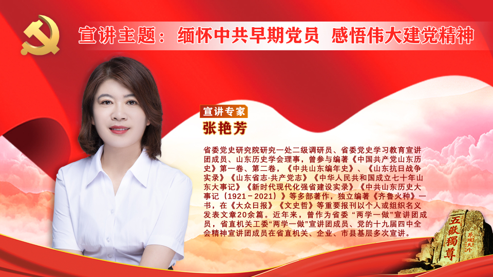 张艳芳:省委党史研究院研究一处二级调研员、省委党史学习教育宣讲团成员、山东历史学会理事,曾参与编著《中国共产党山东历史》第一卷、第二卷,《中共山东编年史》、《山东抗日战争实录》《山东省志·共产党志》《中华人民共和国成立七十年山东大事记》《新时代现代化强省建设实录》《中共山东历史大事记(1921-2021)》等多部著作,独立编著《齐鲁火种》一书,在《大众日报》《文史哲》等重要报刊以个人或组织名义发表文章20余篇。近年来,曾作为省委 “两学一做”宣讲团成员,省直机关工委“两学一做”宣讲团成员、党的十九届四中全会精神宣讲团成员在省直机关、企业、市县基层多次宣讲。
