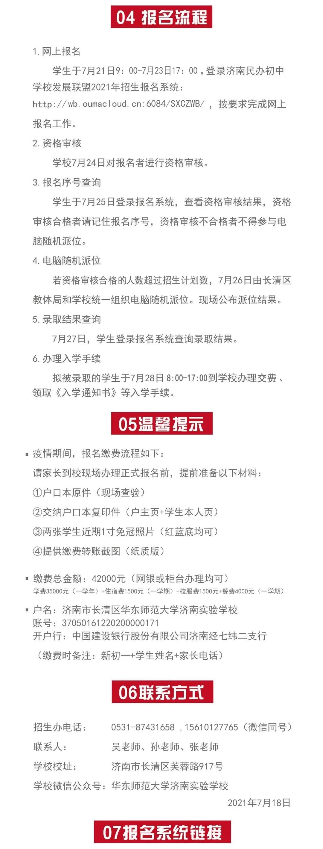 18日,华东师范大学济南实验学校公布2021年初一招生简章,学生可在7月21日9:00——7月23日17:00,登录济南民办初中学校发展联盟2021年招生报名系统: