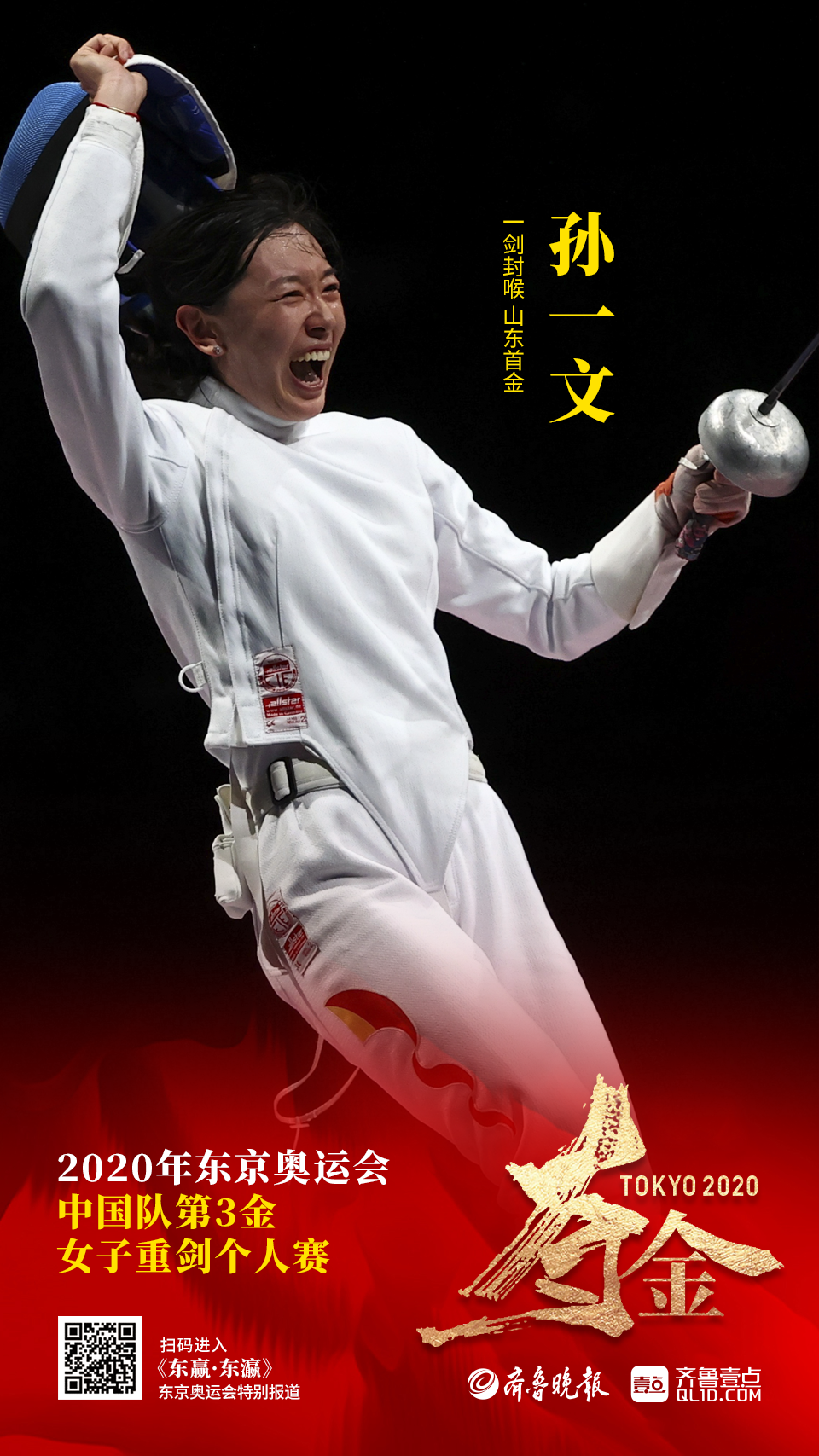7月24日,东京奥运会女子重剑个人赛决赛,山东选手孙一文一剑封喉,击败波佩斯库,斩获中国第三金,同时也是山东选手首枚金牌。