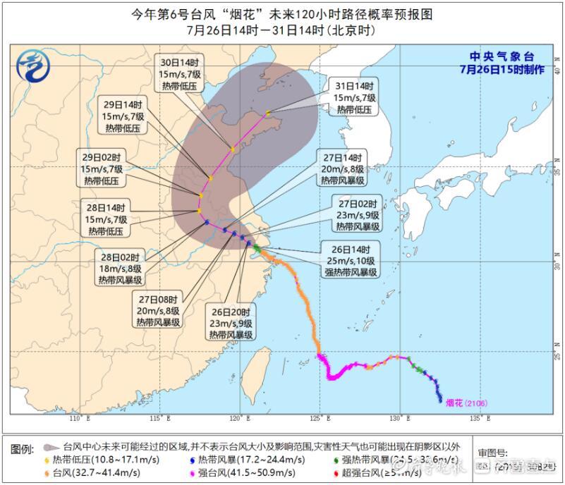 第6号台风“烟花”移动路径预报图