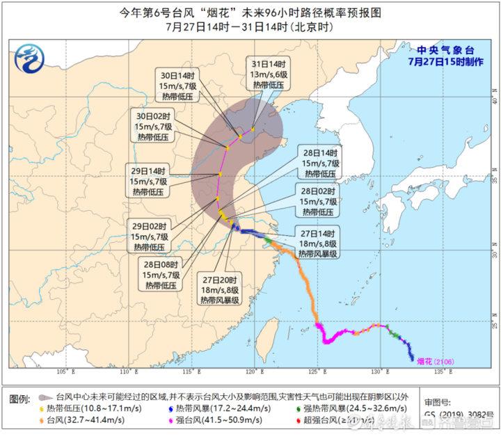 今年第6号台风“烟花”(热带风暴级)的中心今天16时位于江苏省南京市高淳区境内,外围最大风力8级(18米/秒),中心气压985百帕。预计未来“烟花”回旋少动,强度逐渐减弱,其中心于29日凌晨到上午从鲁南进入我省,30日从滨州到东营之间进入渤海(图1)。