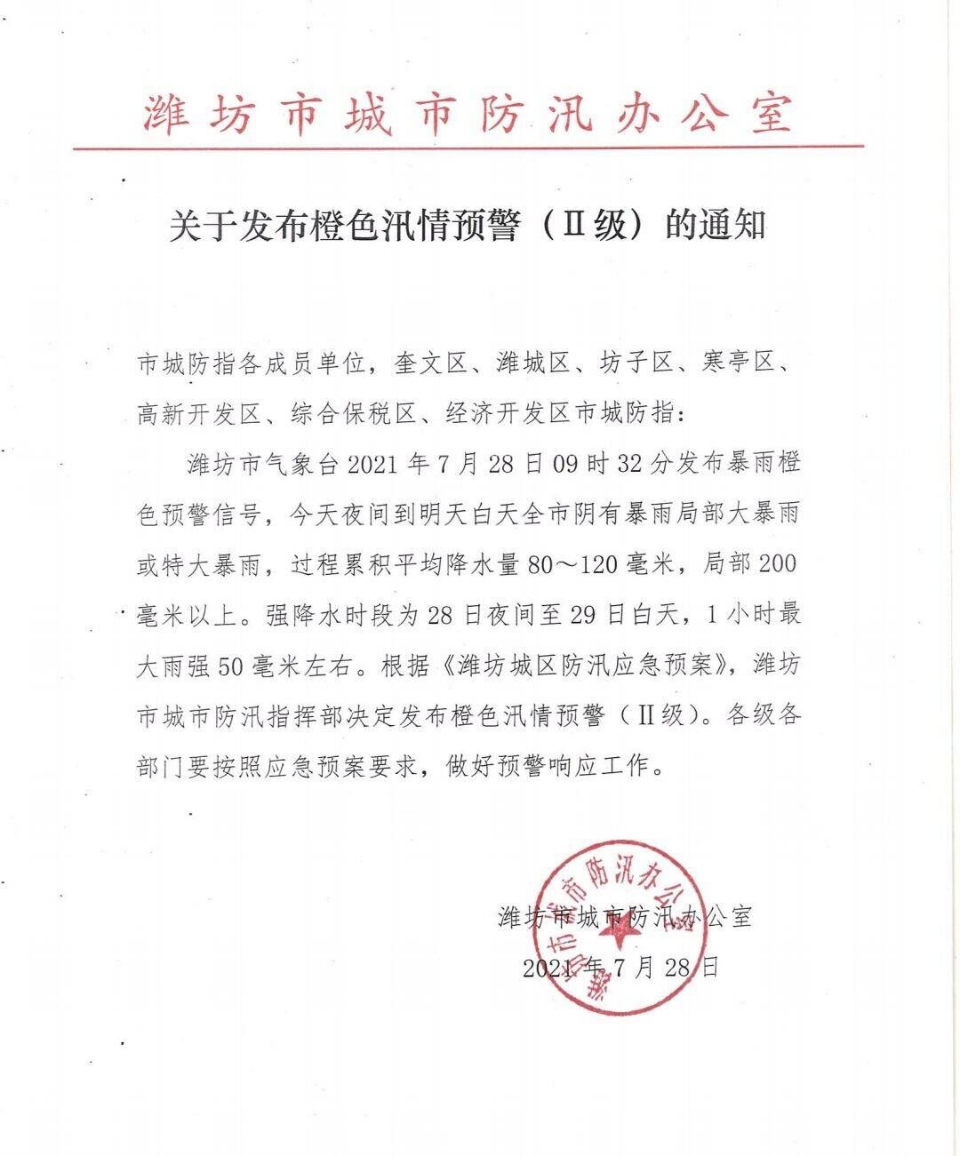 根据《潍坊城区防汛应急预案》,潍坊市城市防汛指挥部决定发布橙色汛情预警(Ⅱ级)。各级各部门要按照应急预案要求,做好预警响应工作。