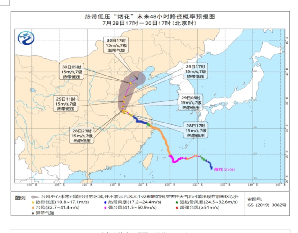 据悉,今年第6号台风“烟花”今天(28日)17时位于位于安徽省淮南市凤台县境内,中心附近最大风力7级(15米/秒、热带低压级),中心气压985百帕。预计未来“烟花”将以每小时10公里左右的速度向偏北方向移动,强度逐渐减弱。其中心于29日凌晨到上午从鲁南进入山东省,30日从滨州北部进入渤海。