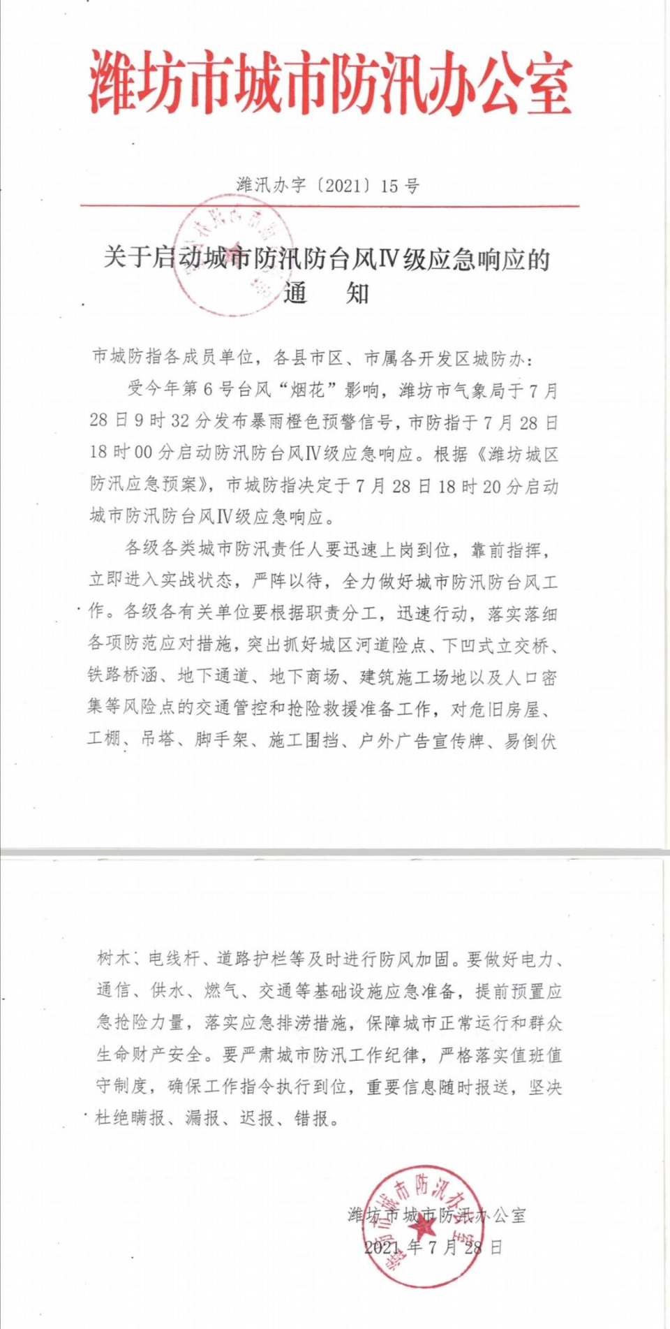 受今年第6号台风“烟花”影响,潍坊市气象局于7月28日9时32分发布暴雨橙色预警信号,潍坊市防指于7月28日18时00分启动防汛防台风Ⅳ级应急响应。根据《潍坊城区防汛应急预案》,潍坊市城防指决定于7月28日18时20分启动城市防汛防台风Ⅳ级应急响应。