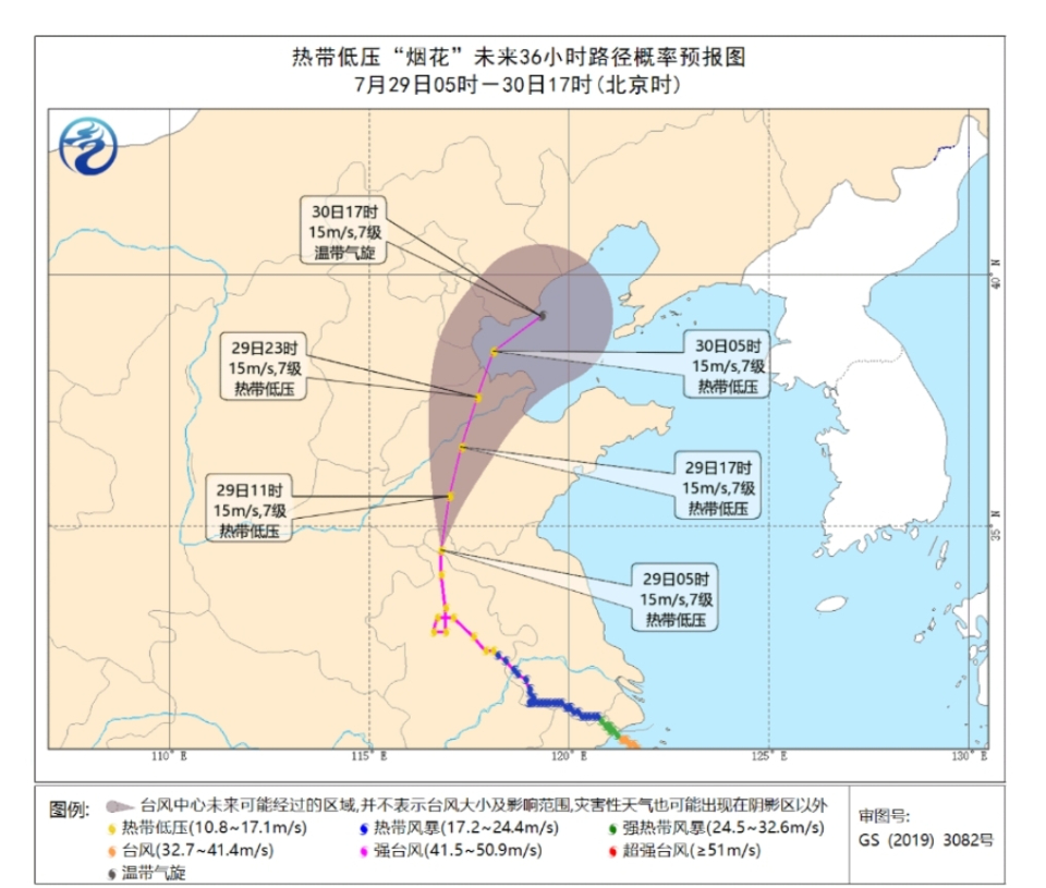 预计未来“烟花”将以每小时20公里左右的速度向北偏东方向移动,强度逐渐减弱。其中心于今天早晨从菏泽到枣庄之间进入我省,30日凌晨从滨州北部进入渤海。