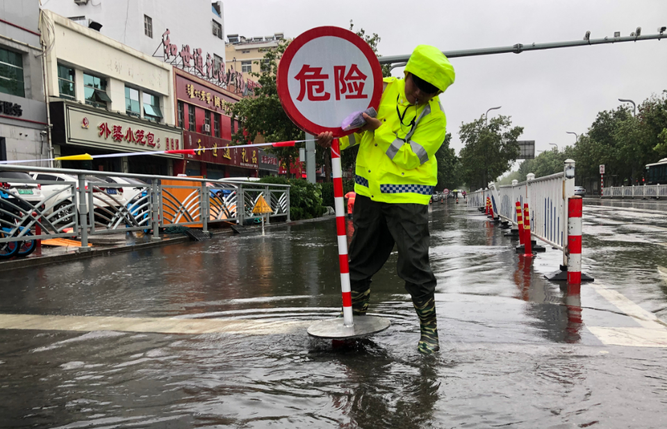 29日,聊城城区,聊城公安交警坚守路面,迎战台风“烟花”