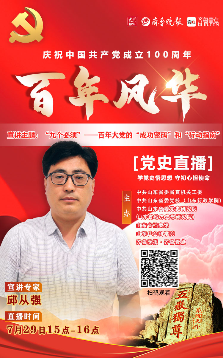直播海报11|邱从强:百年大党的"成功密码"和"行动指南" 云端党课 2021-07-30 5356 学党史悟思想,守初心担使命。中共山东省委省直机关工委、中共山东省委党校、中共山东省委党史研究院(山东省地方史志研究院)、山东省档案馆、山东社会科学院与齐鲁晚报·齐鲁壹点联合主办《“百年风华”党史直播》。第11期直播嘉宾邱从强将宣讲《"九个必须"——百年大党的"成功密码"和"行动指南"》。 责任编辑:聂婧怡