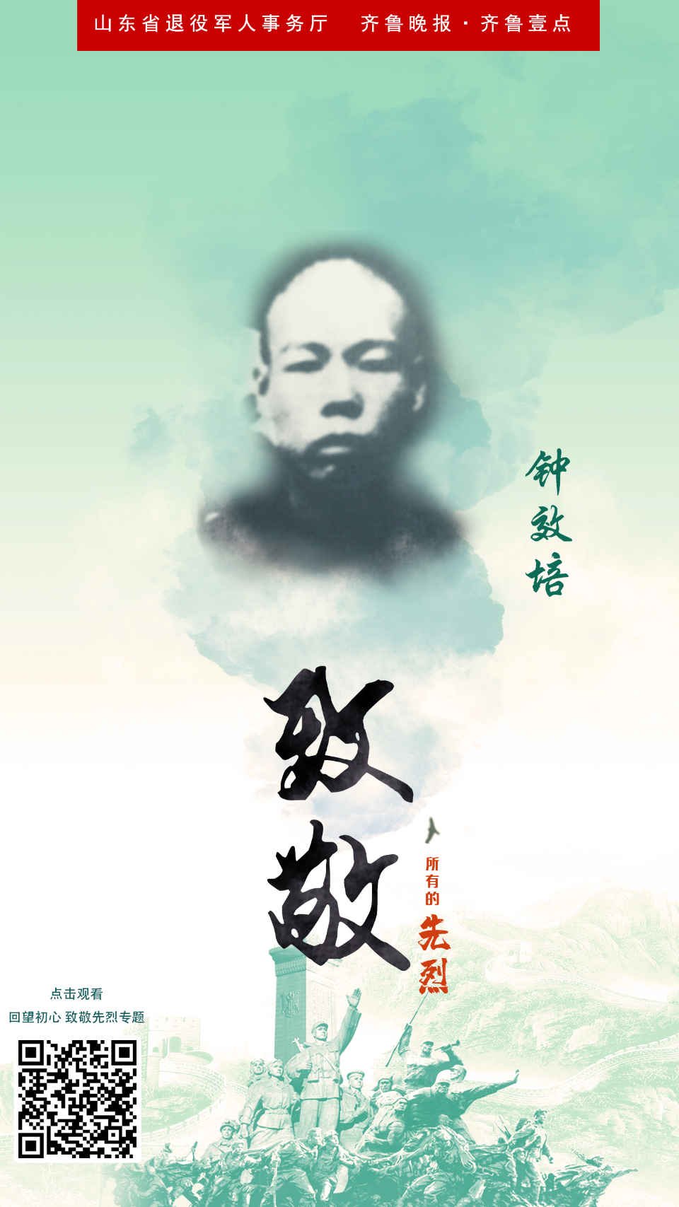 回望初心·致敬先烈海报㉜丨钟效培:万古长青 肝胆相照 云端党课 2021-09-06 2936 在全党开展党史学习教育中,为了铭记党史,缅怀先烈,山东省退役军人事务厅、齐鲁晚报·齐鲁壹点联合主办,共同推出“回望初心·致敬先烈”专题策划,重温中国共产党为中国人民谋幸福、为中华民族谋复兴的不变初心。今天推出钟效培的故事。 责任编辑:李和晴