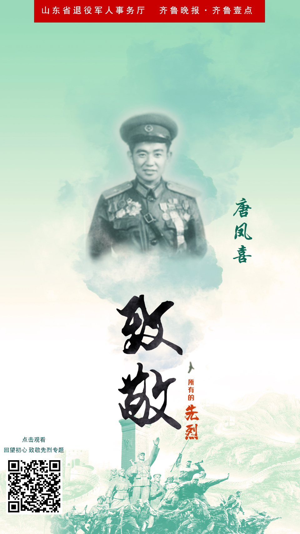 回望初心·致敬先烈海报㊶ | 唐凤喜:孤胆英雄 云端党课 2021-09-30 4688 在全党开展党史学习教育中,为了铭记党史,缅怀先烈,山东省退役军人事务厅、齐鲁晚报·齐鲁壹点联合主办,共同推出“回望初心·致敬先烈”专题策划,重温中国共产党为中国人民谋幸福、为中华民族谋复兴的不变初心。今天推出唐凤喜的故事。 责任编辑:李和晴