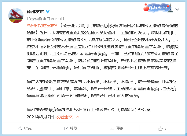关于湖北省荆门市新冠肺炎确诊病例涉德州市密切接触者情况的通报