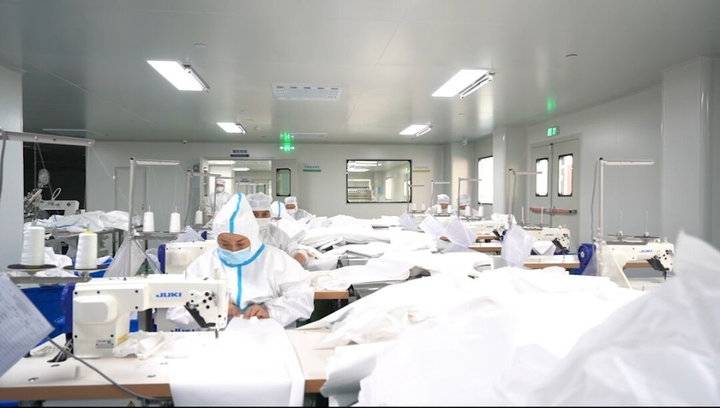 山东舒朗服装公司员工正加班加点生产防护服。通讯员 孙雅楠 摄