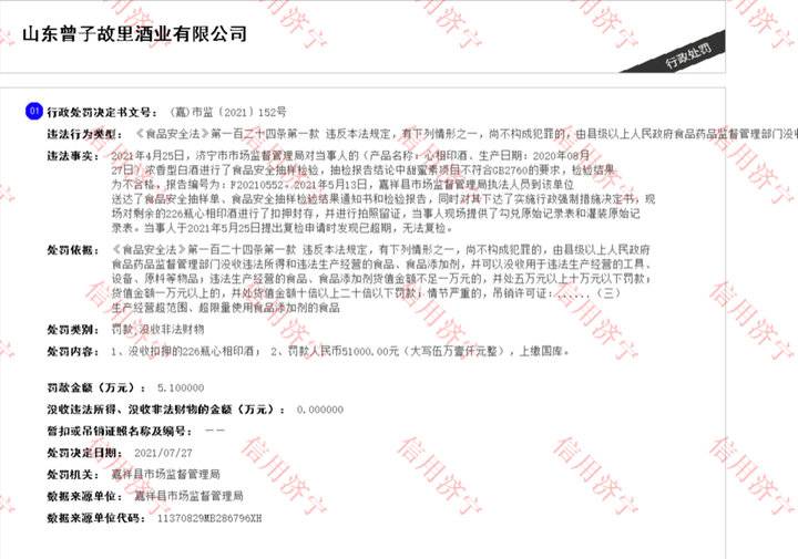 罚5.1万、没收226瓶酒,山东曾子故里酒业甜蜜素不合格被罚