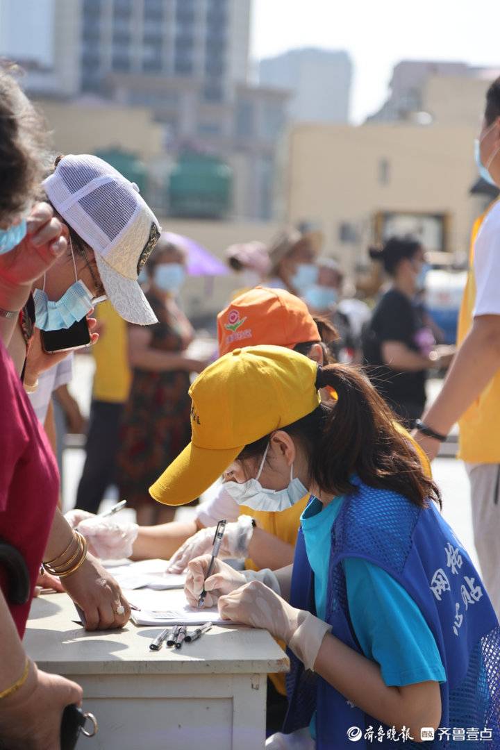 8月4日上午,大海阳社区核酸采集点排队现场,社区工作人员在烈日下为居民登记。齐鲁晚报•齐鲁壹点记者 吕奇 摄