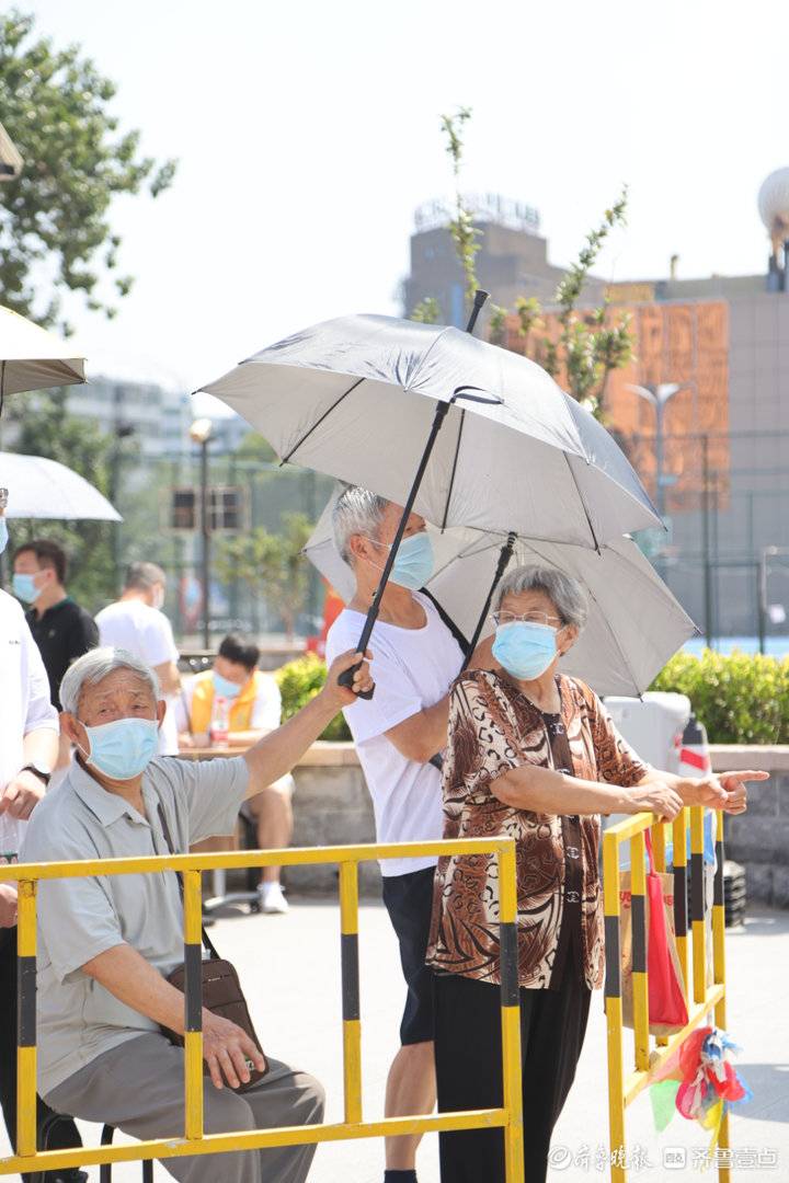 8月4日,大海阳社区核酸采集点排队现场,一位老人为同伴撑起伞遮阳。齐鲁晚报•齐鲁壹点记者 吕奇 摄