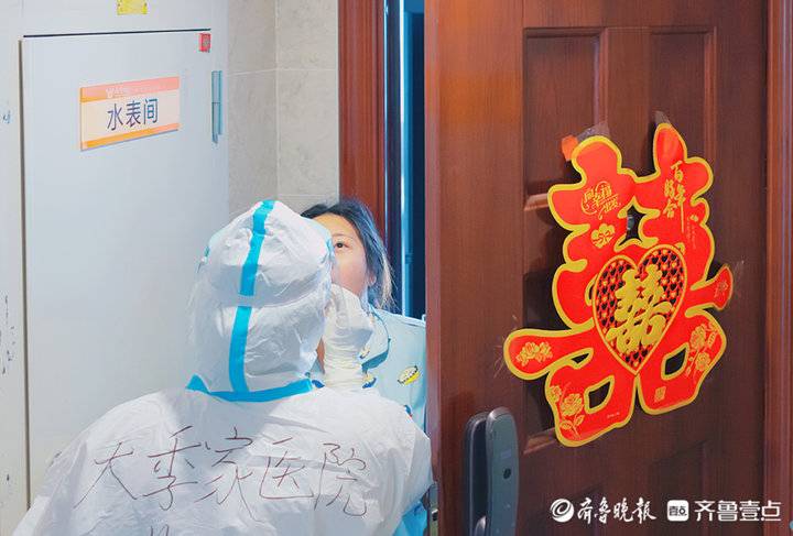 8月8日,烟台开发区越秀星汇金沙小区,医务人员为不方便下楼的居民,上门做核酸检测。壹粉 姚南通 摄