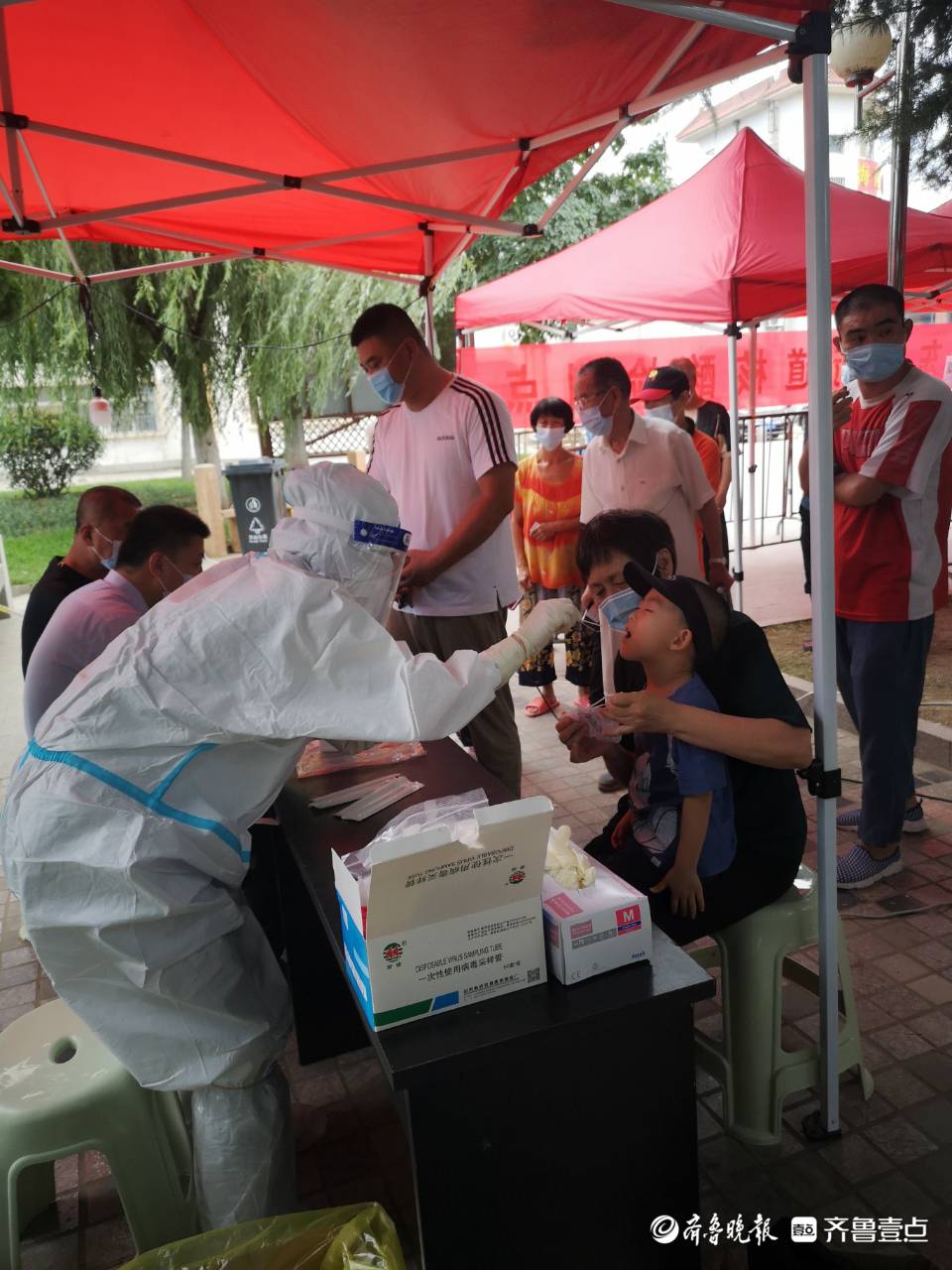 虽然天气炎热,又身穿密不透风的防护服,但医护人员依然一丝不苟地对前来接受核酸检测的市民进行身份信息登记和样本采集。他们顾不上吃 饭、来不及喝水,加班加点,快速规范地采集咽拭子,严格按照操作规程做好核酸采集工作,以实际行动为百姓架起健康“防护墙”。