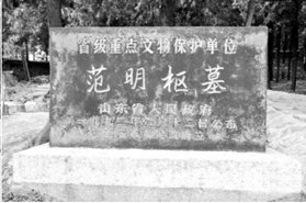 并立石碑三幢,正中一幢镌刻着“故山东省参议会范议长明枢之墓”,左右两