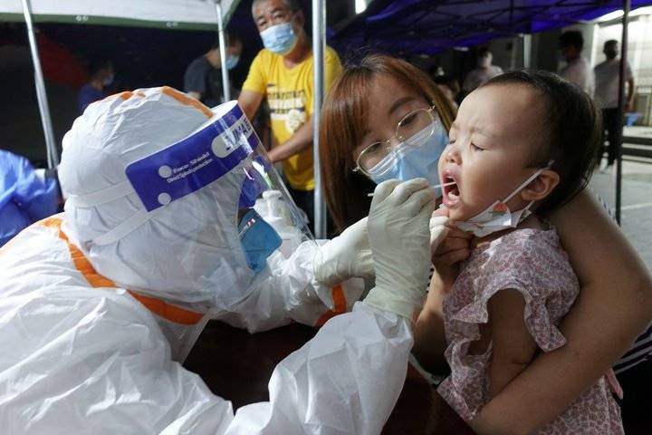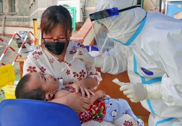 2021年8月13日,在山东省烟台市芝罘区一处核酸采样点,医务人员为一名幼儿进行核酸检测取样。唐克摄