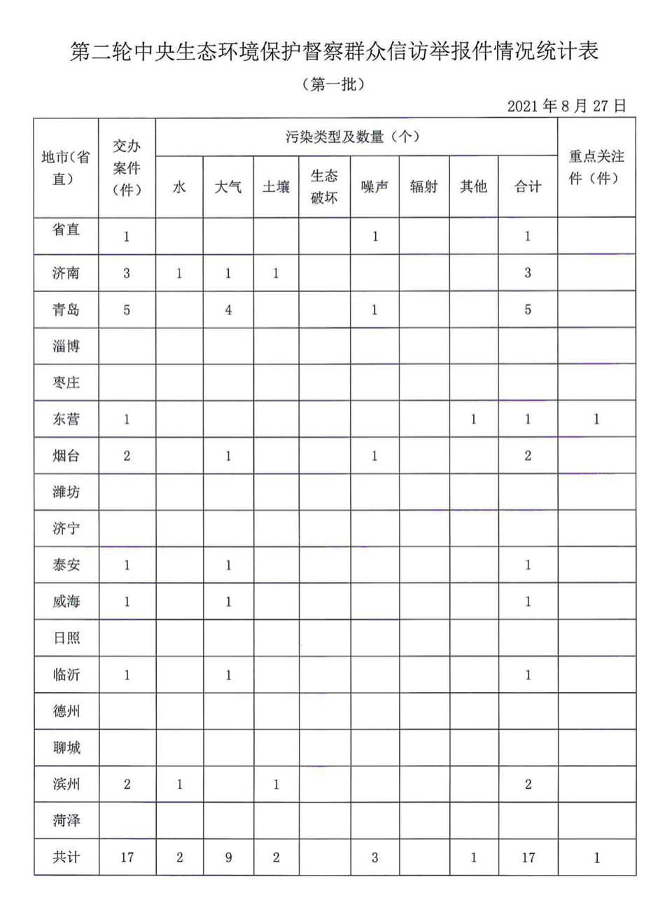 8月27日,中央第二生态环境保护督察组向山东转办第一批信访件17件,其中重点关注案件1件。本批转办的信访件,涉及省直1件、济南市3件、青岛市5件、东营市1件、烟台市2件、泰安市1件、威海市1件、临沂市1件、滨州市2件;涉及环境问题17个,其中水污染问题2个、大气污染问题9个、土壤污染问题2个、噪声污染问题3个、其他问题1个。