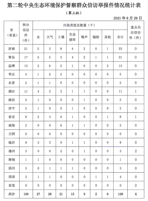 8月29日,中央第二生态环境保护督察组向我省转办信访件100件,其中重点关注件4件。本批信访件涉及济南市21件、青岛市17件、淄博市13件、烟台市11件、泰安市8件、临沂市8件、枣庄市4件、德州市3件、滨州市3件、菏泽市3件、东营市2件、潍坊市2件、济宁市2件、威海市2件、聊城市1件。本批转办的信访件,涉及环境问题 108个,其中大气污染问题28个、水污染问题27个、土壤污染问题21个、生态破坏问题15个、噪声污染问题9个、辐射污染问题2个、其他问题6个。当日,上述信访举报件全部交办各市。按照中央第二生态环境保护督察组的要求,信访举报件的办理情况须在10天内反馈到督察组,整改和处理情况将及时向社会公开。