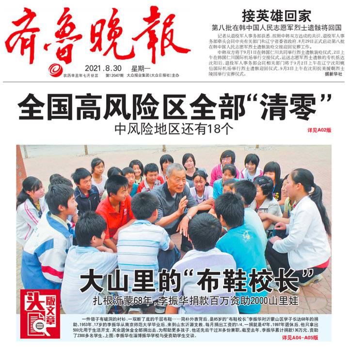 一件领子带破洞的灰蓝色衬衫、一条反复缝补过的深色裤子、一双断了底的白底黑面千层布鞋、一个装有白开水的大塑料水杯……这份“简朴”的背后,是“布鞋校长”李振华对沂蒙山区学子长达68年的捐助。
