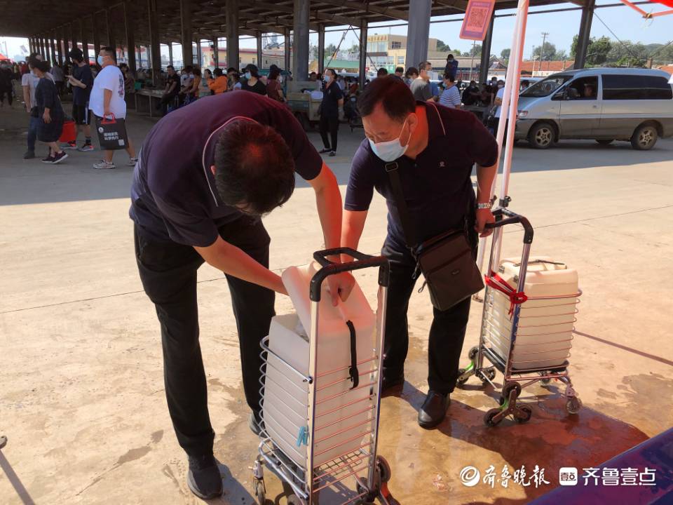 在市场中,有两位市民拖着用塑料桶和购物车自制的买海鲜用的“神器”,十分抢眼。市民告诉记者:“我上午已经买了小鲳鱼在附近饭店加工吃了,这会儿返回来再买点带回家。”记者看到这位市民已经买了带鱼和小鲳鱼,打算继续等待还没回来的渔船,看看还有什么鲜货。